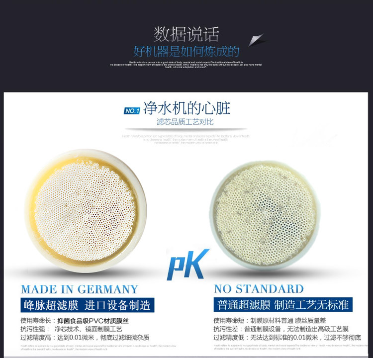 RO濾芯又稱反滲透濾芯,其原理是利用反滲透的原理,采用一種高纖維的濾膜(RO膜)過濾掉水中的雜質。RO膜的孔徑小,過濾效果高,在加上多層防護,能輕而易舉的去除水中的泥沙、重金屬、鐵銹、抗生素等物質。經過RO濾芯過濾的水質,通常情況下是完全可以達到飲用的標準,部分生產技術領先的企業還加上口感因子,相互結合,過濾的水質不僅安全衛士,而且口感和大山里的清泉差不多。故而一直以來,RO濾芯在直飲系列的凈水器產品中都充當著重要的角色。