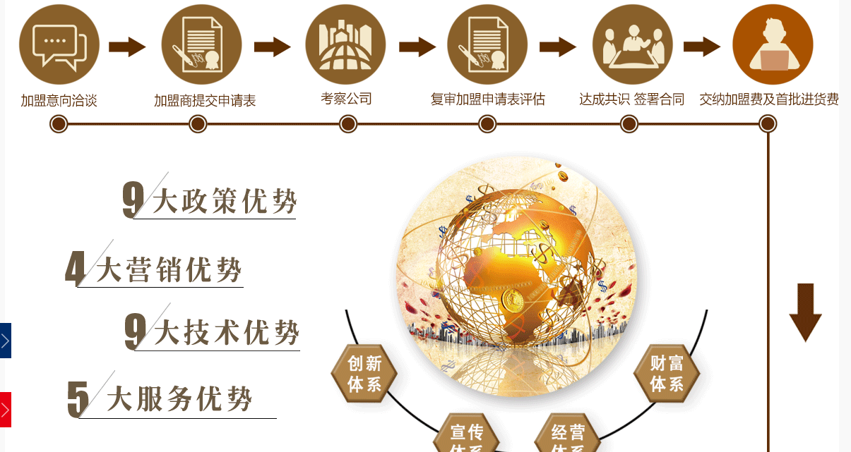 了解漢斯頓公司企業(yè)和產(chǎn)品信息,確定加盟意向——加盟商提交申請表——考察公司——復(fù)審加盟申請表評估——雙方洽談,確定合作方式,簽訂合同——按合同支付相關(guān)費(fèi)用——總部提供自營店裝修效果圖——專業(yè)培訓(xùn)及提供營銷方案——開始運(yùn)作——定期反饋市場信息——漢斯頓公司根據(jù)市場信息總部完善營銷策略。