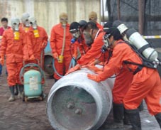 按照演練程序,演練前,公安、消防、醫(yī)護等部門的專業(yè)人員就演練中應該注意的事項、自救逃生知識、急救方法、危化品的特性及應對措施等事項進行了講解。上午9時30分,演練正式開始。在1號目標,模擬液氯鋼瓶發(fā)生泄漏,值班人員發(fā)現(xiàn)后及時向應急救援小組報告,并拉響警報,立即啟動應急救援預案,現(xiàn)場人員緊急安全撤離,救援小分隊全副武裝趕赴現(xiàn)場,用捕消器對準泄漏源進行捕消,迅速做好了封堵等處理,快速將鋼瓶推入液堿池。在1號目標發(fā)生事故的同時,2號目標發(fā)生火災,現(xiàn)場應急小組立即宣布啟動防火災應急救援預案,一邊組織應急小分隊對著火點進行撲救,一邊向黃驊市消防大隊請求支援。不多時,黃驊市消防大隊及醫(yī)護急救車先后趕到,他們立即用高壓水槍對準著火點進行滅火,對受傷人員進行搶救,迅速將傷員送往醫(yī)院。