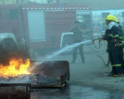 演練現(xiàn)場:消防隊員對火災現(xiàn)場進行撲救