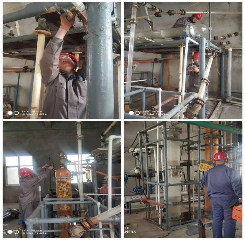 溴素二廠提取冷凝器設備因使用年限長,冷凝器內管有斷裂且沉積物過多堵塞,冷凝效果降低,給溴的蒸餾冷凝及質量、產量帶來影響。針對這種狀況,廠班子研究決定對冷凝器進行集中更換。由于疫情影響,物流停運,春節前在石家莊預定的設備無法正常發貨。為了能夠完成生產任務,溴素二廠職工多次對冷凝器漏水部位采取封堵措施,堅持生產運行。