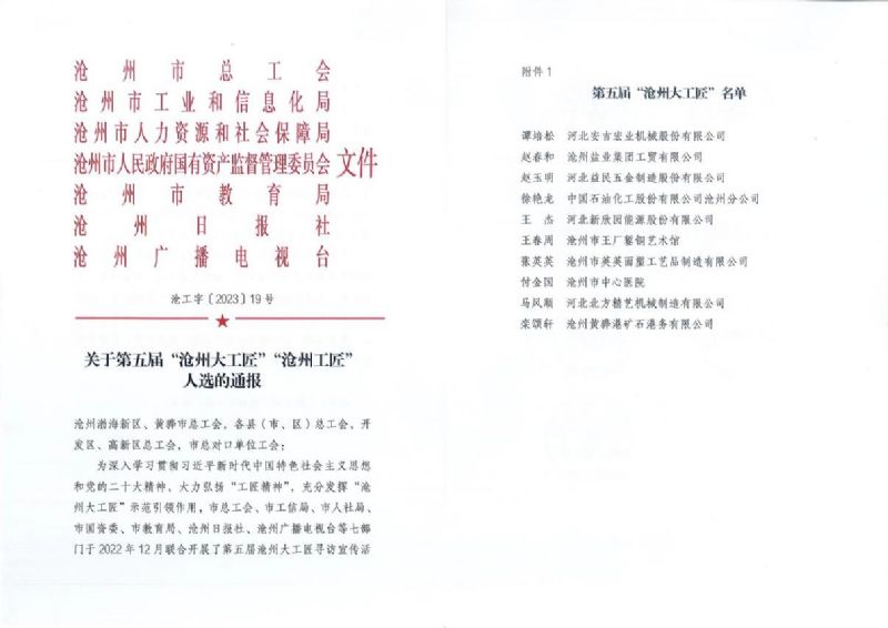 “滄州大工匠”是滄州市企業技能人才的至高榮譽,評選活動由市總工會、市工信局、市人社局、市國資委、市教育局、滄州日報社、滄州廣播電視臺等七部門于 2022 年 12 月聯合開展,面向全市企業長期堅守生產一線、從事技能工作的技工精英�;顒幼罱K評選出滄州大工匠10名,滄州工匠10名。