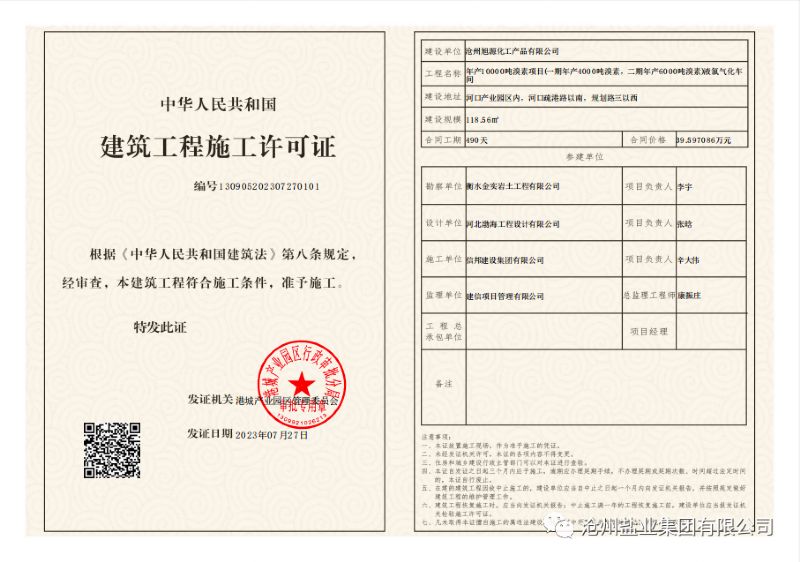 7月27日,滄州旭源化工產(chǎn)品有限公司年產(chǎn)10000噸溴素項目順利取得《建設(shè)工程施工許可證》,標(biāo)志著該項目正式進入施工階段,拉開了溴素擴能建設(shè)的序幕。