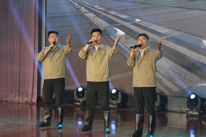 聯(lián)歡會在黃驊市紅色朝陽戰(zhàn)鼓隊(duì)演奏的鼓舞《紅紅火火》中拉開序幕,迅速點(diǎn)燃現(xiàn)場氣氛。隨后的獨(dú)唱《等待》、情景劇《穿越時(shí)空的對話》、薩克斯表演《鐵血丹心》、舞蹈《萬疆》、手語舞《一起走》、講述性朗誦《履職盡責(zé),做新時(shí)代的應(yīng)急奮斗者》、戲曲聯(lián)唱等20個(gè)節(jié)目輪番上演。其中男聲小合唱《曬鹽的漢子》書寫著一代代滿腔熱血的滄鹽人在這片百里荒灘上艱苦奮斗、開拓創(chuàng)新的偉大精神,瞬間將活動(dòng)的氣氛推向高潮;詼諧幽默的三句半《滄鹽新風(fēng)尚有你還有我》展現(xiàn)了滄鹽職工的榮譽(yù)感和自豪感,以及對企業(yè)美好未來的期許與祝福;一曲《長蘆戀》迅速將人們拉進(jìn)30多年前鹽工生產(chǎn)生活的回憶里;滄鹽集團(tuán)三位國家級、省級、市級勞動(dòng)模范合唱的《歌唱祖國》更是以飽滿的熱情唱出了對祖國的熱愛;實(shí)力唱將楊嵐雅、袁冰,滄州星月藝術(shù)團(tuán)的精彩表演更是博得了現(xiàn)場觀眾的陣陣掌聲。最后,演出在一首充滿陽光和希望的歌伴舞《陽光路上》落下帷幕。