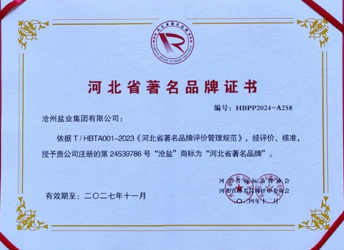近日,河北省商標品牌協會組織開展的2024年度“河北省著名、知名、優秀品牌”評選結果正式揭曉,經過嚴格的評審和篩選,滄州鹽業集團有限公司注冊號為24539786的“滄鹽”牌商標被評定為“河北省著名品牌”,滄州鹽業集團有限公司被授予“河北省商標品牌協會副會長單位”。