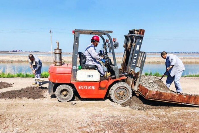 長(zhǎng)蘆公司制鹵二工區(qū)第六泵站通往溴素有限公司溴素三廠的路段因強(qiáng)降雨沖刷,路面坑洼遍布、積水橫流,車輛、人員顛簸難行,既給職工上下班及原料運(yùn)輸帶來(lái)極大不便,也埋下了安全隱患。群眾所盼,行動(dòng)所向。7月18日,溴素三廠10余名黨員干部及骨干組建了突擊隊(duì),備齊鐵鍬、砂石料、叉車等工具設(shè)備,對(duì)該路段進(jìn)了修補(bǔ)。
