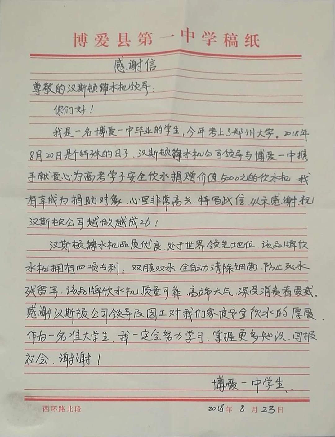原來是河南博愛縣一位受助的高考學(xué)子為感謝漢斯頓的愛心捐助,以及對(duì)其家庭飲水環(huán)境的關(guān)注,特此寫下感謝信表示感謝。信中對(duì)漢斯頓產(chǎn)品給予充分的贊譽(yù),表達(dá)對(duì)漢斯頓公益的觸動(dòng),并期待未來的自己也能回報(bào)社會(huì),感恩社會(huì)!