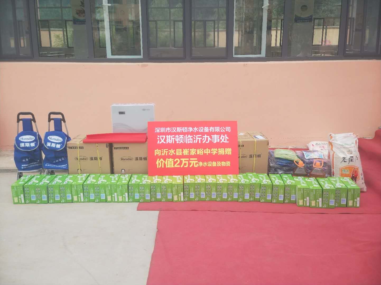 愛是陪伴,細水長流。漢斯頓工作人員,再次走進校園,把愛心送給莘莘學子和在講臺上無私奉獻的老師們。漢斯頓臨沂辦事處向沂水縣崔家峪中學捐贈價值20000元的凈水設備和物資及30箱牛奶。