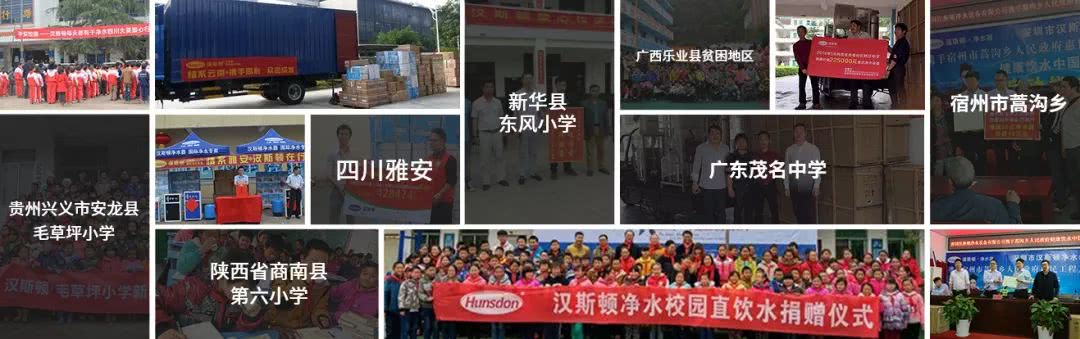 為了讓更多人能喝到健康水,漢斯頓堅持各種公益活動,如:扶貧幫扶活動,漢斯頓向吳堡縣助力10700臺的凈水產品;濟困助學中,漢斯頓走過四川、貴州、湖南、廣西、陜西、甘肅、新疆、云南等省份,助力學子安全飲水,無償捐贈價值億元的凈水設備;在賑災救援中,漢斯頓第一時間做出表率,除了保障災區人民飲水健康的凈水設備,還無償捐贈各類物資;2018下半年,漢斯頓開展“凈化一杯水,助力中國夢”凈水公益,到目前已進行了幾十站,捐贈額度數百萬元……