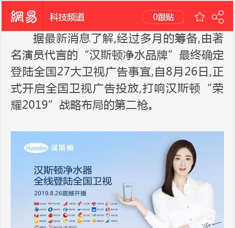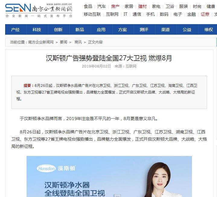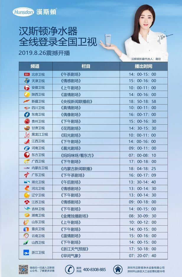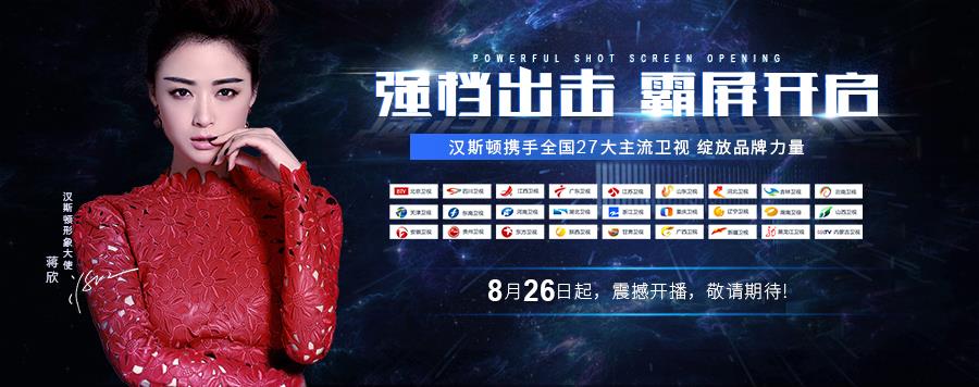 對漢斯頓品牌來講,2019年,注定是瘋狂的一年,是不平凡的一年,而8月更是意義非凡。「漢斯頓“榮耀2019」戰略布局的第二槍開啟了。8月26日起,漢斯頓凈水品牌廣告片在北京衛視、浙江衛視、廣東衛視、江蘇衛視、湖南衛視、江西衛視、東方衛視等27省王牌電視臺強勢播出,品牌魅力全面爆發,高頻次亮相,強勁品牌推廣,敬請期待!