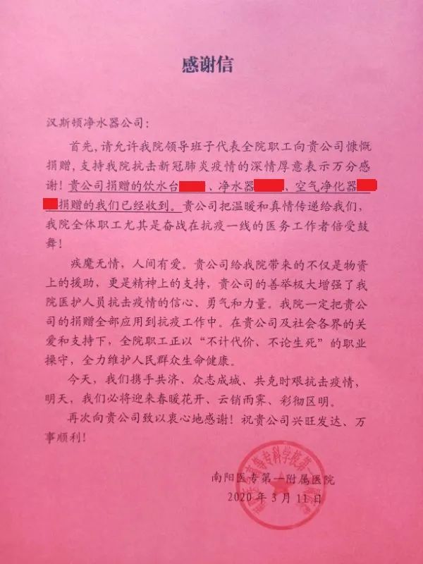 漢斯頓集團向南陽醫專第一附屬醫院捐贈商用飲水臺、凈水器和多用途空氣凈化器等產品,為奮戰在抗“疫”一線的醫護人員提供多方位的防護保障。