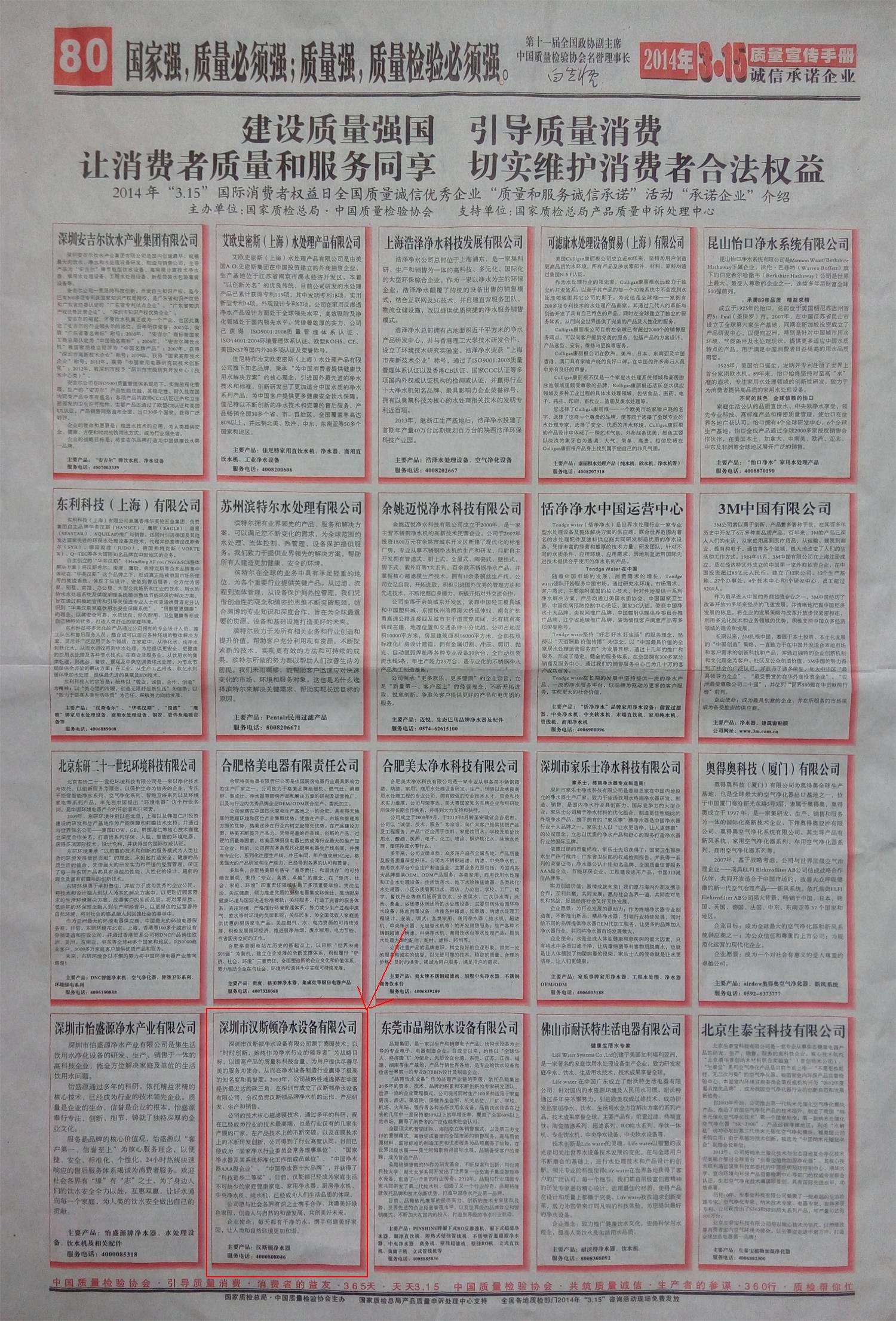 漢斯頓榮登《質量宣傳手冊》3.15專版:打造凈水界高品質名企