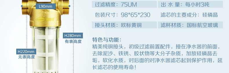 第一:前置過濾器。把好全屋水處理第一關,安裝在入戶端,過濾鐵銹、泥沙、懸浮物等二次污染,使您的進戶水達到自來水公司出廠時的標準。