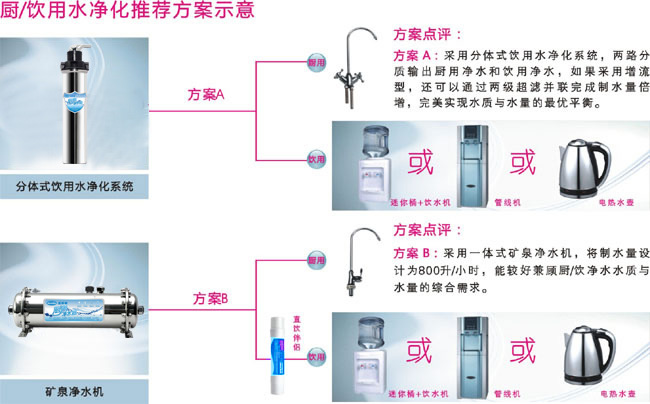 家庭廚/飲用水凈化,是指廚/飲兼顧,同時凈化。飲水除了要求水質干凈無雜質,還要求口感好;家庭廚房用水,除了要求水質安全,還要求流量足夠,能滿足日常廚用的洗、煮等用水量要求。要同時解決廚/飲用水凈化,最好的方案是分質分量輸出凈水,從水質和水量兩方面滿足需求。實現分質與分量,就實現了最優使用各種深度凈水工藝的效能,最大發揮各種凈水工藝的特點。