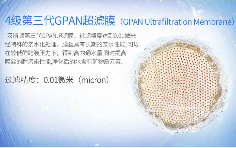 其中GPAN超濾膜,采用內(nèi)壁鏡面光滑技術(shù),具有易于沖洗,防止二次污染;有更好的親水性、通透性好、彈性好,可以承受水壓達到12公斤,而普通的凈水材料僅有8公斤的承壓;不會出現(xiàn)短絲等現(xiàn)象;材料具有殺菌抑菌的功能;使用壽命比普通超濾膜壽命更長等特點。