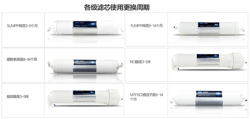 凈水器濾芯需要定期更換,這是選購凈水器產品首先需要了解的。任何凈水器產品都需要定期更換濾芯以保證水質的安全。所謂的膜類濾芯永久使用壽命只是理論上的。相對于活性炭和PP棉等一次使用而言。就想鋰離子電芯一樣,盡管膜類濾芯可以反復使用,但仍然會因膜的不耐腐蝕性和老化等現象而終止。一般來說膜類濾芯可以通過沖洗來提高使用壽命。以下是各種濾芯的使用和更換周期。